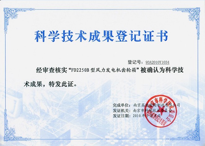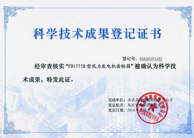 2010年8月26日,在南京高速齒輪制造有限公司(以下簡稱:高速公司)400畝廠區(qū),召開了“ FD1775B、FD2250B型風力發(fā)電機齒輪箱”科技成果鑒定會。會議邀請了南京理工大學、南京航空航天大學、東南大學、南京市江寧區(qū)科技局等單位的專家、領(lǐng)導組成了鑒定委員會。鑒定委員會聽取了高速公司的項目研制工作總結(jié)等報告,審查了相關(guān)技術(shù)文件,考察了生產(chǎn)現(xiàn)場。最終一致認為高速公司研制的兩項產(chǎn)品總體技術(shù)水平達到了國際同類產(chǎn)品先進水平,同意通過科技成果鑒定,并希望進一步擴大國內(nèi)外市場。