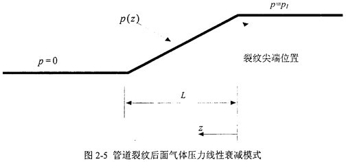 更為簡(jiǎn)便的是圖2-5所示的氣體壓力衰減模式是線(xiàn)性衰減函數(shù),圖中以裂紋擴(kuò)展方向z為橫軸,壓力分布p為縱軸,其計(jì)算表達(dá)式為