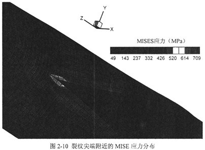 首先觀察裂尖附近的MISES應(yīng)力分布,如圖2-10。按以針狀鐵素體和塊狀鐵素體組織為主的X70鋼級(jí)管線(xiàn)鋼的平均屈服強(qiáng)度500~600MPa估算,計(jì)算給出的裂尖前部塑性區(qū)長(zhǎng)度大約在3個(gè)單元長(zhǎng)度以?xún)?nèi),即0.15m左右。