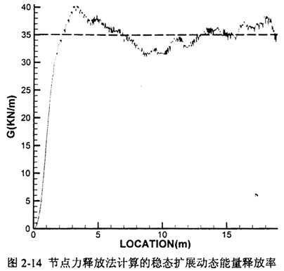 如圖2-8,隨著裂紋起裂后的迅速擴(kuò)展,裂紋驅(qū)動(dòng)力上升直至達(dá)到并保持在穩(wěn)定的數(shù)值,這一平臺(tái)值1.6KN/m就是裂紋穩(wěn)態(tài)(steady state)擴(kuò)展的驅(qū)動(dòng)力G。裂紋尖端的移動(dòng)過(guò)程中,G在該值附近有一些小的波動(dòng),這是由于裂紋長(zhǎng)度的突然增加和位移約束的突然解除,引起的有限元解的高頻振蕩。振蕩的幅度與有限元單元網(wǎng)格的疏密和單元內(nèi)節(jié)點(diǎn)力釋放的指定規(guī)律有關(guān)。