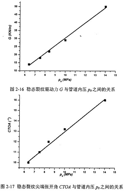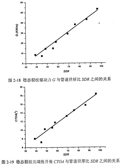 在裂紋穩(wěn)態(tài)擴(kuò)展的條件下,動(dòng)態(tài)能量釋放率G或裂紋尖端張開(kāi)角CT(劉同管道內(nèi)壓p0或徑厚比SDR之間均呈線(xiàn)性關(guān)系。由此關(guān)系可便捷地推算任意設(shè)計(jì)參數(shù)下的裂紋驅(qū)動(dòng)力。通過(guò)和第四章介紹的小試件實(shí)驗(yàn)的動(dòng)態(tài)斷裂韌性結(jié)果相對(duì)照,可以得到裂紋止裂或擴(kuò)展的結(jié)論。