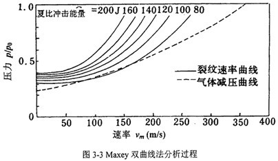 雙曲線法的具體分析過程如圖3-3所示,坐標(biāo)橫軸表示速度,縱軸表示氣體壓力或環(huán)向應(yīng)力。上方的一組曲線表征不同韌性水平下的斷裂速度,是內(nèi)壓或環(huán)向應(yīng)力的函數(shù)。隨著內(nèi)壓或環(huán)向應(yīng)力在斷裂過程中的減小,斷裂速度不斷降低。如果壓力或應(yīng)力足夠低,斷裂速度即減小到零而發(fā)生止裂。