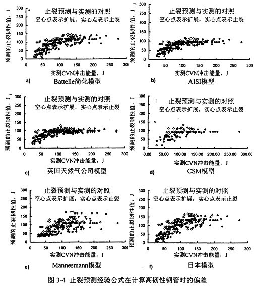 圖3-4表示了Battelle應(yīng)用Maxey雙曲線法對全尺寸實驗數(shù)據(jù)庫所做的DDF止裂韌性預(yù)測,圖3-4a至圖3-4f分別對應(yīng)于式(3-3)至式(3-8)。圖中顯示的實驗用管的鋼級包括X52到Xl00,管徑范圍從4O6mm到1422mm,實驗最高壓力超過16MPa。可見,預(yù)測模型在管材韌性低于某一水平時預(yù)測結(jié)果與實物實驗結(jié)果基本吻合,但當(dāng)管材韌性較高時出現(xiàn)明顯偏差,預(yù)測應(yīng)該止裂的管線沒有止裂。經(jīng)典的止裂預(yù)測模型在預(yù)測夏比能量值高于94J的管材時,已經(jīng)偏于危險,即過高估計了管材的止裂性能。