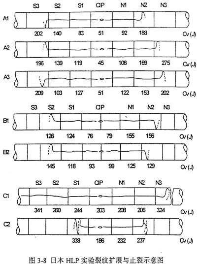 A系列實驗中,裂紋沿夏比沖擊能量CKV值約為50J的起裂管CIP,依次穿過韌性值遞增排列的鋼管。各管段的大致韌性值是在每次爆破實驗后經(jīng)過精心研究確定的。A3中Sl到S2是唯一的例外;