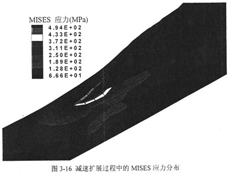 根據(jù)圖3-16中的MISES應(yīng)力分布可以判斷裂尖處的塑性區(qū)范圍。隨著裂紋擴(kuò)展過程中韌性導(dǎo)致的速度降低,塑性區(qū)的范圍逐漸縮小。