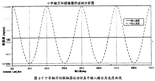 由圖4-9可以知道,當(dāng)輸入軸轉(zhuǎn)速恒定為90o/s時(shí),輸出軸并不作恒速轉(zhuǎn)動(dòng),而是以90o/s為中心,作非常有規(guī)律的周期性運(yùn)動(dòng),在每一個(gè)回轉(zhuǎn)周期中,它的變化頻率為3次。這里的結(jié)果同第三章中的曲線圖3-8也是完全吻合的,因此在一定的程度上也證明了三叉桿萬(wàn)向聯(lián)軸器轉(zhuǎn)速分析理論的正確性。