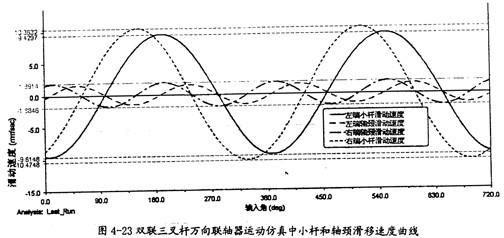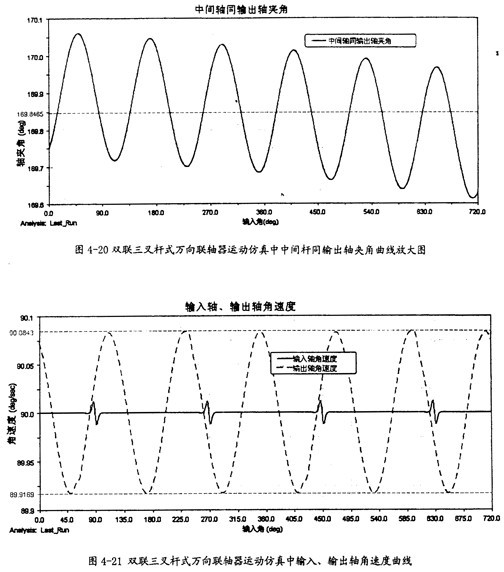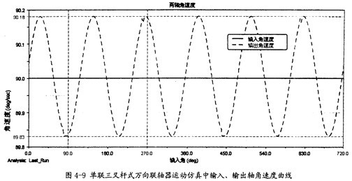 由圖4-21可以看出,雙聯(lián)三叉桿式萬(wàn)向聯(lián)軸器同單聯(lián)三叉桿式萬(wàn)向聯(lián)軸器的輸出曲線相似,當(dāng)輸入軸轉(zhuǎn)速恒定時(shí),輸出軸轉(zhuǎn)速呈現(xiàn)有規(guī)律的波動(dòng),在每一個(gè)回轉(zhuǎn)周期中,它的變化頻率為3次,同圖3-8中的β=10°時(shí)的曲線相比,雙聯(lián)同單聯(lián)的情況差不多,故三叉桿式萬(wàn)向聯(lián)軸器在雙聯(lián)的結(jié)構(gòu)形式下輸出轉(zhuǎn)速特性直觀上無(wú)改善。