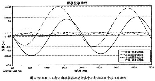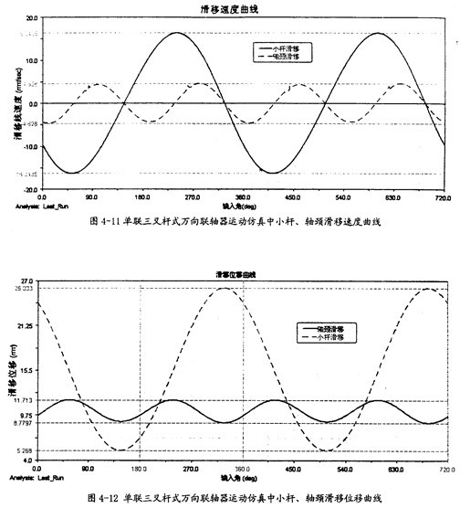 由圖4-12可以知道,在一定的夾角下,小桿在滑道中的滑移位移同小桿球面中心相對(duì)軸頸的滑移位移是不同的,前者(20.76mm)要遠(yuǎn)大于后者(2.93mm),且它們變動(dòng)的頻率也不一樣,在一個(gè)回轉(zhuǎn)周期中,前者步率是1次,而后者2次。此圖中的兩曲線同第三章中的理論分析曲線圖3-9、圖3-10是吻合的。這在一定的程度上也證明了三叉桿式萬(wàn)向聯(lián)軸器理論分析中對(duì)小桿滑移位移和軸頸滑移位移這兩項(xiàng)計(jì)算的正確性。