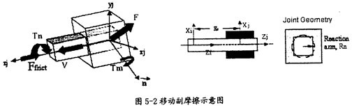移動(dòng)副產(chǎn)生摩擦的示意圖如圖5-2所示。在這種運(yùn)動(dòng)副中只會(huì)產(chǎn)生逆向于移動(dòng)方向v(如圖5-2中藍(lán)色箭頭所示)的摩擦力Ffrict(如圖5-2中紅色箭頭所示),它的產(chǎn)生主要由三種因素,即構(gòu)件間相互作用的徑向力F、構(gòu)件間相互作用的扭矩Tn、構(gòu)件間相互作用的彎矩Tm(這三種力如圖5-2中綠色箭頭所示)。在施加由這些作用力產(chǎn)生的摩擦力時(shí),要考慮徑向力F的大小、等效作用臂長(zhǎng)Rn(如圖5-2中右邊圖所示運(yùn)動(dòng)副間的重疊量和重疊量的變化情況、扭矩Tn的大小和它的等效反作用臂長(zhǎng)Rn、彎矩Tm的大小和彎矩的反作用臂長(zhǎng)XS(如圖5-2中間圖所示)。另外還得考慮靜摩擦系數(shù)、動(dòng)摩擦系數(shù)及預(yù)載荷的作用。