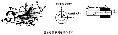圓柱副產(chǎn)生摩擦的示意圖5-3所示。在這種動(dòng)動(dòng)副中會(huì)產(chǎn)生逆向于移動(dòng)方V(如圖5-3中藍(lán)色箭頭所示)的摩擦力Ffrict(如圖5-3中紅色箭頭所示)及逆向于旋轉(zhuǎn)方向ω(如圖5-3中藍(lán)色箭頭所示)的摩擦扭矩Ffrict(如圖5-3中紅色箭頭所示),它的產(chǎn)生主要由兩種因素,即構(gòu)件間相互作用的徑向力F、構(gòu)件間相互作用的彎矩Tm(這兩種力如圖5-3中綠色箭頭所示)。在施加這些作用力產(chǎn)生的摩擦力時(shí),要考慮徑向力F的大小、圓柱半徑RP(如圖5-3中間圖所示)、運(yùn)動(dòng)副間的重疊量和重疊量的變化情況、彎矩Tm的大小和彎矩的反作用臂長(zhǎng)Xs(如圖5-2中右圖所示),另外還得考慮靜摩擦系數(shù)、動(dòng)摩擦系數(shù)及預(yù)載荷的作用。