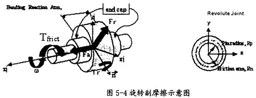 旋轉(zhuǎn)副產(chǎn)生摩擦的示意圖如圖5-4所示。在這種運(yùn)動(dòng)副中只會(huì)產(chǎn)生逆向于旋轉(zhuǎn)方向。(如圖5-4中藍(lán)色箭頭所示)的摩擦扭矩Tfrict(如圖5-4中紅色箭頭所示),它的產(chǎn)生主要由三種因素,即構(gòu)件間相互作用的徑向力Fr、構(gòu)件間相互作用的軸向力Fa、構(gòu)件間相互作用的彎矩Tr(這三種力如圖5-4中綠色箭頭所示)。在施加由這些作用力產(chǎn)生的摩擦力時(shí),要考慮徑向力Fr的大小、圓柱半徑RP(如圖5-4右圖所示)、軸向力Fa的大小、摩擦半徑Rn的大。ㄈ鐖D5-4右圖所示)、彎矩Tm的大小和彎矩的反作用臂長(zhǎng)(即旋轉(zhuǎn)副的長(zhǎng)度,如圖5-4中左圖所示),另外還得考慮靜摩擦系、動(dòng)摩擦系數(shù)及預(yù)載荷的作用。