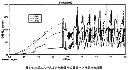 以上所有的測(cè)量結(jié)果均是在同-次仿真中得到,仿真歷時(shí)0.8秒,雙聯(lián)三叉桿式萬(wàn)向聯(lián)軸器在仿真中經(jīng)歷了從啟動(dòng)到平穩(wěn)波動(dòng)的動(dòng)態(tài)過(guò)程。在所有力的測(cè)量曲線中,曲線有突變現(xiàn)象,這-現(xiàn)象可能同模型中的剛體假設(shè),以及靜摩擦系數(shù)到動(dòng)摩擦系數(shù)和突變有關(guān),如果用柔性體代替剛體,其結(jié)果應(yīng)該會(huì)平滑。但總的來(lái)說(shuō),這里的曲線在-定的程度上反應(yīng)了這些力的變化趨勢(shì),也可以作為分析的參考。