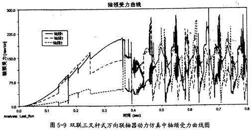 由圖5-9可以看出,雙聯(lián)三叉桿式萬(wàn)向聯(lián)軸器在動(dòng)力仿真的過(guò)程中, 雙聯(lián)三叉桿一端的三軸頸同內(nèi)球頭的圓柱副上的作用力變化趨勢(shì)同圖5-8中的小桿變化趨勢(shì)是相同的。由于它們的受力變動(dòng)復(fù)雜,故這三力在雙聯(lián)三叉桿一端上的向量和也可能不為0。這樣在雙聯(lián)三叉桿上也會(huì)產(chǎn)生附加彎矩的作用。而且軸頸受力平均較小桿的受力要大。
