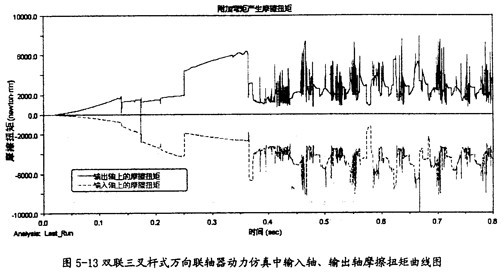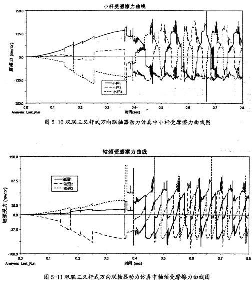 由圖5-12可以看出,雙聯(lián)三叉桿式萬(wàn)向聯(lián)軸器在動(dòng)力仿真的過(guò)程中,其一端的三個(gè)小桿所受的摩擦力的合力變動(dòng)較有規(guī)律,其值在開始一段平滑,其后幾乎以0為中心波動(dòng)。由于這三個(gè)摩擦力的方向均平行于輸入軸或輸出軸軸線,故此合力會(huì)在輸入軸和軸出軸上產(chǎn)生軸向的力,在輸入軸和輸出軸上產(chǎn)生摩擦扭矩。如取其水平較高值60牛來(lái)計(jì)算,它產(chǎn)生的摩擦扭矩為270N·mm(60×0.3×15=270,其中0.3為動(dòng)摩擦系數(shù),15為摩擦半徑),此值相對(duì)圖5-13中的值而方相當(dāng)小。
