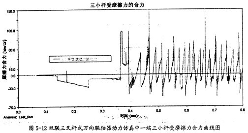 由圖5-11可以看出,雙取三叉桿式萬(wàn)向聯(lián)軸器在動(dòng)力仿真的過(guò)程中,其一端的三內(nèi)球頭同軸頸間的摩擦力變化相當(dāng)有規(guī)律。當(dāng)內(nèi)球頭相對(duì)軸頸運(yùn)動(dòng)反向時(shí),綜們就會(huì)在正負(fù)間有規(guī)律的切換。但在這里產(chǎn)生摩擦力的平均大小要較小桿上的小得多。