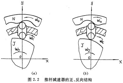 在推桿減速器中,設(shè)激波器按順時(shí)針方向旋轉(zhuǎn),則傳動(dòng)圈C,內(nèi)齒圈N的轉(zhuǎn)向可能與激波器相同,也可能相反(圖2.2)。為了研究問題的方便,本文中稱傳動(dòng)圈與主動(dòng)件激波器轉(zhuǎn)向相同的結(jié)構(gòu)為正向結(jié)構(gòu)(圖2.2(a)),稱傳動(dòng)圈與激波器轉(zhuǎn)向相反的結(jié)構(gòu)為反向結(jié)構(gòu)(圖2.2(b))。