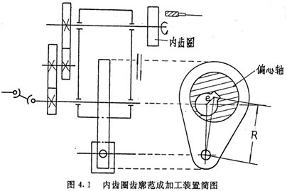 目前,在推桿減速器的批量生產(chǎn)中,其內(nèi)齒圈齒廓的加工采用的都是范成加工方法,加工的夾具及刀具的相對(duì)運(yùn)動(dòng)完全模擬減速器的運(yùn)動(dòng)。激波器的偏心距e由一個(gè)偏心軸的偏心距e來(lái)實(shí)現(xiàn),激波器的半徑Tb與內(nèi)滾子半徑Tz之和由偏心軸的幾何中心至固定點(diǎn)的距離R來(lái)實(shí)現(xiàn),傳動(dòng)比由掛輪的傳動(dòng)比來(lái)實(shí)現(xiàn),如圖4.1所示。