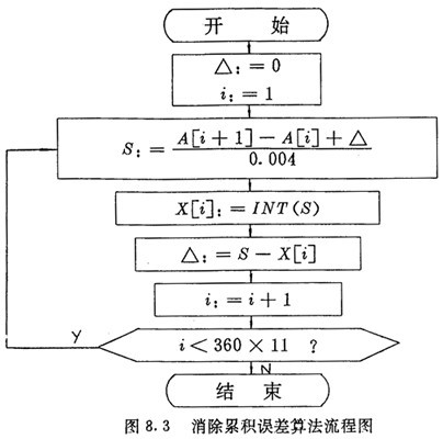 用式(4.4)及式(4.5)計(jì)算nx和nc時(shí),得到的不可能恰好是整數(shù),為了消除累積誤差,每段中應(yīng)把上一段的誤差考慮進(jìn)去。例如對(duì)nx的計(jì)算,假定表8.1中Pd的360×11個(gè)數(shù)已存在數(shù)組A中,計(jì)算后的360×11-l個(gè)脈沖數(shù)nx存在數(shù)組x中,則計(jì)算過程如圖8.3所示。