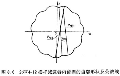 將2GW4-12擺桿減速器的設(shè)計(jì)參數(shù)代入公法線條件式(7.79)中,并給外滾子半徑Tz以增量0.18mm代入,可得到三條不同長(zhǎng)度的公法線,如圖8.6所示。