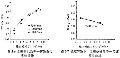 在額定轉(zhuǎn)速和額定轉(zhuǎn)矩范圍內(nèi),改進(jìn)型機(jī)隨著輸出轉(zhuǎn)矩、輸入轉(zhuǎn)速的增加,均載機(jī)構(gòu)補(bǔ)償?shù)恼`差增大,均載效果更加明顯,所以改進(jìn)型機(jī)的傳動(dòng)效率隨輸入轉(zhuǎn)速的增加而增加。綜上所述,三環(huán)減速機(jī)的測(cè)得效率可達(dá)92%以上,因此本實(shí)驗(yàn)從減速機(jī)的傳動(dòng)性能上來(lái)講是成功的。