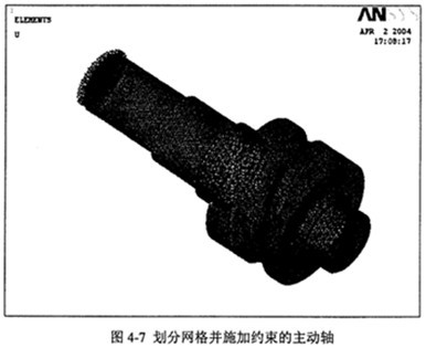 四面體單元每個節(jié)點有三個自由度(Tx,Ty,Tz),通過限制節(jié)點的自由度,對模型施加約束。模擬軸承的作用,在安裝軸承處的零件表面施加約束,首先將表面上所有節(jié)點的坐標由笛卡爾坐標(x,y,z)轉(zhuǎn)換為柱坐標(R,θ,Z),然后限制自由度R。并在主動軸的輸入軸端面和導(dǎo)架的輸出軸端面,限制所有節(jié)點的自由度。劃分網(wǎng)格并施加約束的主動軸見圖4-7。