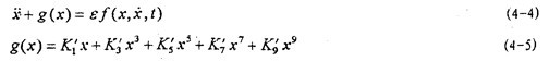目前文獻(xiàn)上的一些方法對(duì)于弱非線性系統(tǒng)是有效的,而對(duì)于(4-2)式的強(qiáng)非線性系統(tǒng)則遇到了麻煩。由于描述非線性振動(dòng)系統(tǒng)的微分方程種類繁多,沒(méi)有普遍的解法,因此,仍然只有極少非線性振動(dòng)方程可求得精確解?尚械霓k法是針對(duì)不同非線性振動(dòng)方程的特點(diǎn)尋求一些近似數(shù)值解法。為研究方便,將(4-2)式進(jìn)一步寫成以下形式: