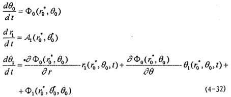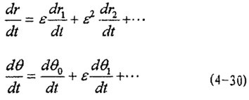 這就是對(duì)應(yīng)于(4-20式的頻閃差分方程,即(4-2)式在Poicare平面上以T為周期的點(diǎn)變換方程。如ε充分小,則可令△τ=dτ,△r=dr,△θ=dθ,此外,(4-36)中的