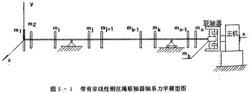 在第三章,根據(jù)試驗(yàn)的基礎(chǔ)建立了具有非線性遲滯特性聯(lián)袖器的恢復(fù)力模型。這一章,將研究一個(gè)帶有這種聯(lián)軸器的軸系如圖5-1所示,該軸系有n個(gè)圓盤,由鋼絲繩聯(lián)軸器與主機(jī)相連接,按以下原則建立力學(xué)模型: