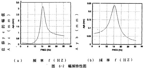 (虛線)。從這兩圖中曲線的比較還可以知道,鋼絲繩聯(lián)軸器對(duì)圓盤振幅的影響在不同頻率段效果是不相同的?偟膩(lái)說(shuō),在頻率12.7~18.3赫茲區(qū)域外,聯(lián)軸器對(duì)圓盤振動(dòng)是起減振作用的,這一特性可以從圖6-1(c)清楚地看到。但在此頻率范圍內(nèi),聯(lián)軸器對(duì)圓盤振動(dòng)是增大作用的。