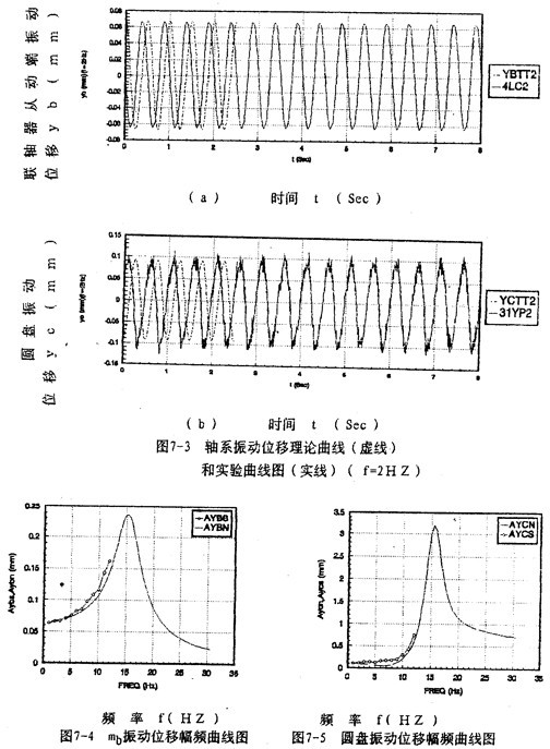 測量數(shù)據(jù)進行分析處理后,結(jié)果如圖7-2~圖7-5所示。圖7-2(a)~(b)和圖7-3(a)~(b)分別給出調(diào)速頻率為1。2赫茲時圓盤和聯(lián)軸器從動端y方向的振動位移時域曲線,圖7-4、圖7-5分別給出聯(lián)軸器從動端、圓盤y方向的振動位移的理論和實驗幅頻曲線圖(實線為理論曲線,圓點線為實驗曲線),總的來看,理論與實驗結(jié)果較好地重合。然而,在某些頻率點處,振運位移幅值的理論計算與實驗結(jié)果相差值,雖然絕對值差異并不大,但從相對值來講,差異較大,這是由于軸系還受到諸多因素,如軸承認、軸承、電動機等振動的相互影響;當然,測試儀器,數(shù)據(jù)處理都有可能產(chǎn)生誤差。由圖7-2、7-3還可以看到,理論計算與實驗所得的振動位移時域曲線之間存在著相位差,這是因為采集數(shù)據(jù)時,時域曲線的相位不能保證與理論計算相位一致造成的,但這不影響兩者的本質(zhì)特性。
