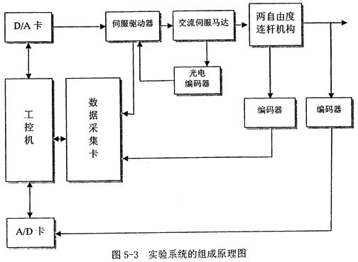 4.數(shù)據(jù)處理:(l)微機(jī)將電機(jī)位置信號(hào)作數(shù)值微分求得電機(jī)轉(zhuǎn)速。(2)微機(jī)用數(shù)字濾波程序?qū)⒓铀俣刃盘?hào)作濾波、數(shù)值積分等處理。如圖5-3所示為實(shí)驗(yàn)系統(tǒng)的組成原理圖: