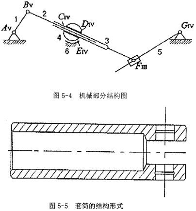首先將原來(lái)的原理圖轉(zhuǎn)換成以下的機(jī)構(gòu)結(jié)構(gòu)圖(僅部分轉(zhuǎn)換),如圖5-4,即原來(lái)2、3構(gòu)件之間是滑塊和連桿連接,現(xiàn)改為連桿、套筒改為加一個(gè)擺動(dòng)軸結(jié)構(gòu),原來(lái)滑塊3和地面連接,容易形成過(guò)約束,改為加一個(gè)擺動(dòng)軸承4來(lái)和地面、套筒來(lái)連接。擺動(dòng)軸承內(nèi)芯相當(dāng)于一個(gè)球副,其轉(zhuǎn)動(dòng)中心必為內(nèi)芯的球心,當(dāng)然也是整個(gè)擺動(dòng)軸承的中心。這樣便于加工查和實(shí)驗(yàn)實(shí)施,而且更重要的是可防止原來(lái)原理圖中桿件連接出形成過(guò)約束。