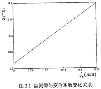 由3.2圖可以看出,當齒側(cè)隙jn由0變化至.25毫米時(查資料取較大最小側(cè)隙參考值),齒輪變位系數(shù)差X2-X1的變化量由近0.32變化到0.50,變化了約0.18。