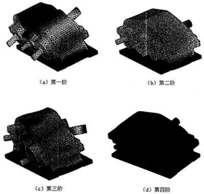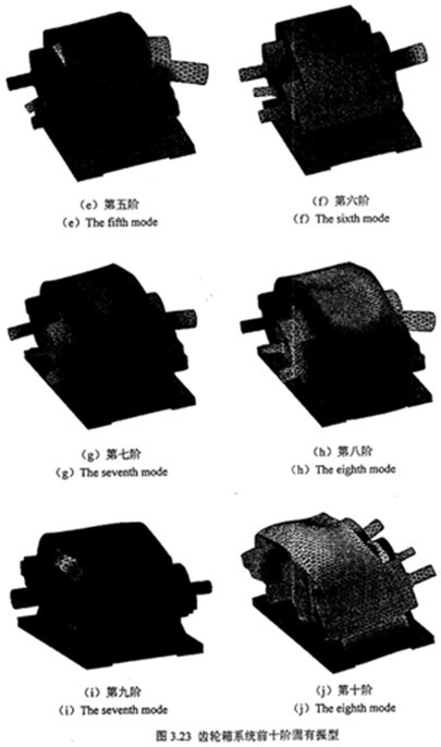 如圖3.22 所示的齒輪系統(tǒng)有限元模型,根據(jù)實際的安裝情況,為了能比較準確地反映實際狀態(tài),箱體的邊界條件為:箱體底座垂直方向約束,四個螺栓孔處全部固定約束。則研究齒輪系統(tǒng)的約束模態(tài),表3.14~3.15分別為用I-Deas軟件的Lanczos模態(tài)求解法計算得到的各重要零部件及齒輪系統(tǒng)前上10階固有頻率和響應(yīng)的振型情況。限于篇幅,圖3.23給出了齒輪系統(tǒng)的前十階固有振型。