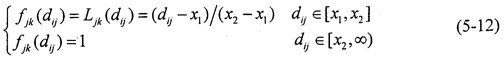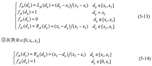 4.進(jìn)行灰色聚類(lèi) 對(duì)象矩陣進(jìn)行聚類(lèi),聚類(lèi)類(lèi)別選為“1”、“2”、“3”三類(lèi)時(shí),其白化權(quán)函數(shù)分別與式(5-12)~(5-14)和圖5-4對(duì)應(yīng)。