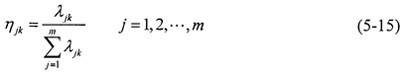 對(duì)象矩陣進(jìn)行聚類(lèi),聚類(lèi)類(lèi)別選為“1”、“2”、“3”三類(lèi),其白化函九分別與式(5-12)~(5-14)和圖5-4對(duì)應(yīng),F(xiàn)以f1為例,說(shuō)明求得白化函數(shù)閾值的方法。對(duì)應(yīng)象矩陣中的第一列,d(max)=1;d(mean)=0.917,取0.9,d(min)=0.8621,取0.86。因此,對(duì)于灰類(lèi)1,有x1=0,x2=1;對(duì)于灰類(lèi)2,有x1=0,x2=0.9,x3=2×x2=1.8;對(duì)于灰類(lèi)3,有x1=0.86,x3=2×x1=1.72。同理可求出其余各分目標(biāo)各類(lèi)白化權(quán)的閾值,代入式(5-12)~(5-14)中求出各類(lèi)白化權(quán)函數(shù)及其值。按式(5-15)求出標(biāo)定聚類(lèi)權(quán)矩陣η