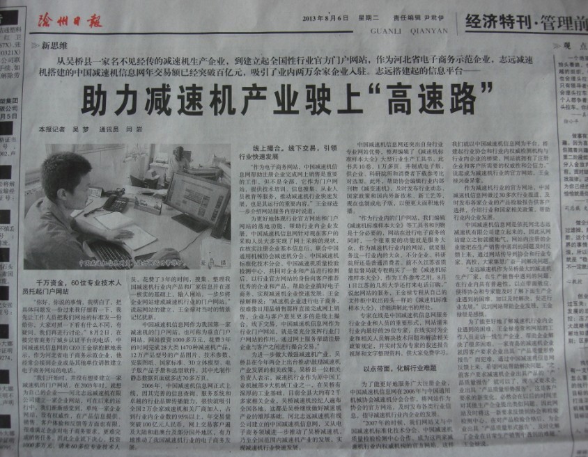 ![]() 8月2日,滄州日報記者吳夢在吳橋縣宣傳部閆巖的陪同下,對減速機(jī)信息網(wǎng)進(jìn)行了深入的采訪。8月6號,滄州日報刊登了財經(jīng)專題報道“助力減速機(jī)產(chǎn)業(yè)駛上高速路”。以下是報道全文: