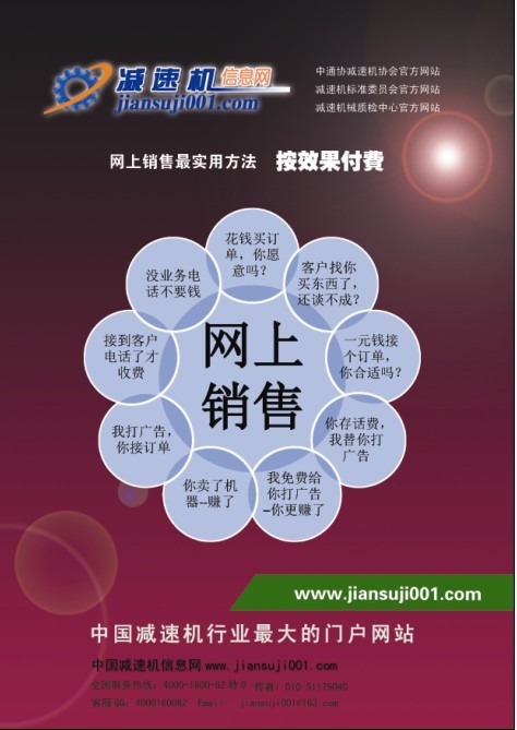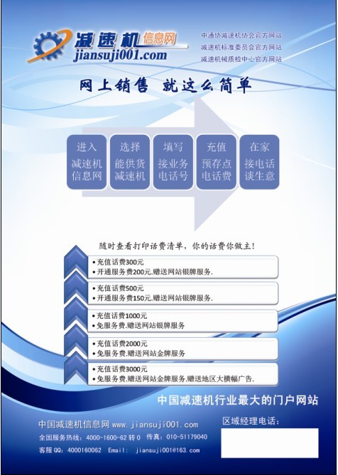 1、在減速機信息網(wǎng)會員后臺填寫你接業(yè)務的電話號碼 2、選擇你能銷售的產(chǎn)品。 3、在自己帳戶里充值話費。 4、開通網(wǎng)上銷售。 5。在家等業(yè)務電話,銷售產(chǎn)品。