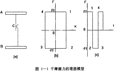 雙線性模型是非線性遲滯系統(tǒng)模型中最簡單的一種,而且也是最為久遠的模型,對于它的初始機理研究最早可追溯到三十年代的Deo Hartog,他在研究干摩擦?xí)r提出了干磨擦的理想模型,他認為在一個具有干摩擦面的單自由度系統(tǒng)中,干摩擦力隨相對滑移位移的關(guān)系可用一矩形來表示,如圖1-1所示。當(dāng)該系統(tǒng)受到外力激勵發(fā)生運動時,干摩擦力總是與運動速度反向而且阻礙運動,進而耗損系統(tǒng)的能量,從時域的角度看,干摩擦力的波形為矩形波,Den Hartog還按能量耗散相等原理,把理想干摩擦等效成粘性阻尼。實際上干摩擦交界面,在外力小于摩擦力時,兩邊就有變形,隨著外力的增加,此變形隨之增大,這是因為交界面兩邊的物質(zhì)有一定的彈性。即使兩邊有較大的滑移時,交界面上的干摩擦力仍然不是常數(shù),而是隨振幅的增大而緩慢上升的。Earlestes等人對此作了描述,認為一旦交界面有了滑移,干摩擦的線性力不是常數(shù)(4Ffπ),而是與相對位移X有關(guān),從Ff變到4Ff/π,表達式為