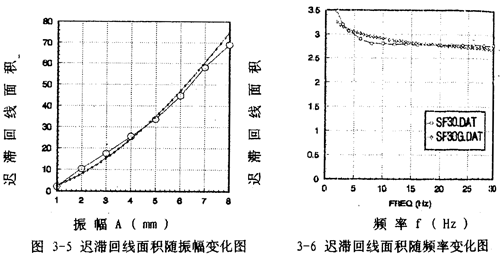 對(duì)于(3-22)模型,我們用阻尼耗能的能量關(guān)系來(lái)辨識(shí)阻尼力與振幅和頻率的關(guān)系。在前面,遲滯回線面積(即阻尼耗能)與振幅的函數(shù)關(guān)系已建立起來(lái),見(3-38)式,而且式中參數(shù)也已辨識(shí)出。同樣,用數(shù)值積分,可以算出振幅一定,頻率變化時(shí)遲滯回線的面積,由此得出遲滯回線面積與頻率的對(duì)應(yīng)關(guān)系,將這些對(duì)應(yīng)關(guān)系畫成曲線如圖3-6中大圓點(diǎn)曲線所示。由遲滯回線面積隨頻率變化的規(guī)律分析,可建立其函數(shù)關(guān)系為:
