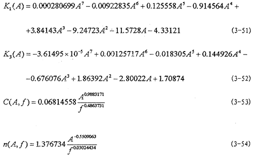 然后用線性參數(shù)辨識(shí)法和非線性參數(shù)辨識(shí)法,根據(jù)上面已經(jīng)得到的各個(gè)工況下K1(A),K3(A),K5(A),C(A,f)和n(A,f)的數(shù)值對(duì)(3-48)、(3-49)、(3-50)式中各參數(shù)進(jìn)行辨識(shí),將辨識(shí)得到各參數(shù)代入(3-48)、(3-49)和(3-50)式得:
