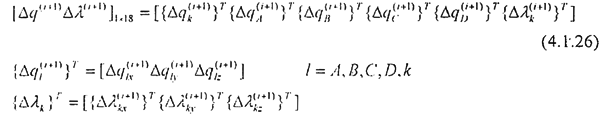 [△q(i+1)△λ(i+1)]1×18=[{ △qk(i+1)}T{△qA(i+1)}{ △qB(i+1)}{ △qC(i+1)}{ △qD(i+1)}T{△λk(i+1)}]      (4.1.29)