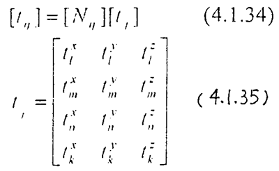 矩陣內(nèi)項(xiàng)表示分布力在單元角點(diǎn)l,m,n,k上沿x,y ,z的分量。對于一個(gè)單元有