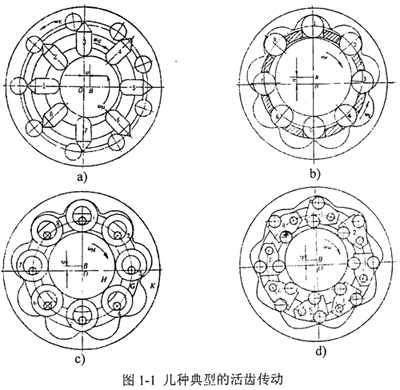 活齒少齒差行星傳動簡稱為活齒傳動,是由K-H-V型少齒差行星齒輪傳動演化而成的一種新型齒輪傳動,并利用一組中間活動件——活齒來傳遞兩同軸間的回轉(zhuǎn)運(yùn)動。常見的活齒傳動分為推桿活齒傳動(圖1-la)、滾柱(鋼球)活齒傳動(圖1-1b)、套筒活齒傳動(圖1-1c)、擺動活齒傳動(圖1-ld)等。因為活齒傳動具有結(jié)構(gòu)緊湊、傳動比范圍廣、承載能力大、傳動效率高等優(yōu)點,所以它一出現(xiàn)就引起科技工作者的廣泛注意。