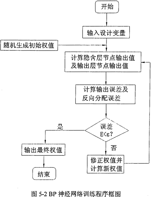 三層前饋型BP網(wǎng)絡(luò)采用BP算法來調(diào)整網(wǎng)絡(luò)連接權(quán)值和節(jié)點(diǎn)閾值。BP算法,即誤差逆?zhèn)鞑W(xué)習(xí)方法,是一種曲型的誤差修正方法。BP算法是一個(gè)種有教師的學(xué)習(xí)算法,整個(gè)網(wǎng)絡(luò)學(xué)習(xí)過程由信息的正向傳動(dòng)播和誤差的反向傳播兩上階段構(gòu)成,在正向傳播的過程中,輸入信息從輸入層經(jīng)隱含層逐層處理,并傳向輸出層,如果不能在輸出層得到期望的輸出,則轉(zhuǎn)入反向傳播,運(yùn)用梯度下降法連接權(quán)關(guān)于誤差函數(shù)的導(dǎo)數(shù)沿原來的連接通路返回,通過修改各層的權(quán)值使得誤差函數(shù)減小,直到達(dá)到收斂為止。神經(jīng)網(wǎng)絡(luò)練過程如圖5-2所示。