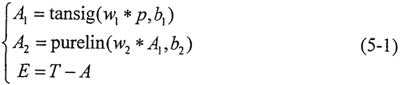 SSE=sumsqr(T-pruelin(w2*tansig(w1*p,b1),b2)) (5-3)