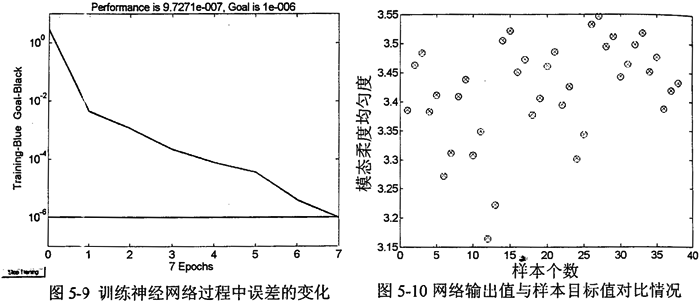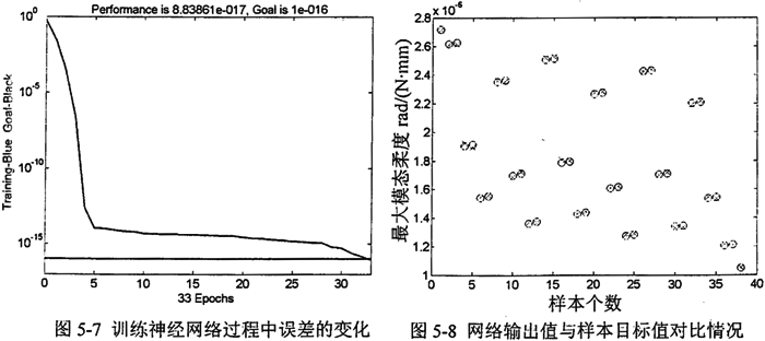 進(jìn)行動(dòng)態(tài)優(yōu)化時(shí),若要建立起目標(biāo)函數(shù),首先要獲得一組能夠精確計(jì)算f4(x)的權(quán)值,這就需要通過樣本訓(xùn)練BP神經(jīng)網(wǎng)絡(luò),當(dāng)誤差精度達(dá)到要求時(shí),訓(xùn)練停止,并得到了該組權(quán)值,利用該組權(quán)值與設(shè)計(jì)變量通過三層BP網(wǎng)絡(luò)可以計(jì)算出訓(xùn)練后的分目標(biāo)函數(shù)值f4(x)。在訓(xùn)練神經(jīng)網(wǎng)絡(luò)時(shí),學(xué)習(xí)速率取為0.01,動(dòng)量常數(shù)取為0.9,目標(biāo)誤差取為l×10-16。當(dāng)訓(xùn)練結(jié)束時(shí),網(wǎng)絡(luò)輸出值與樣本目標(biāo)值之間的誤差均方根值為8.8386×l0-17(見圖5-7),訓(xùn)練過程誤差的變化情況及訓(xùn)練完成后網(wǎng)絡(luò)輸出值與樣本目標(biāo)值對比情況如圖5-8所示。