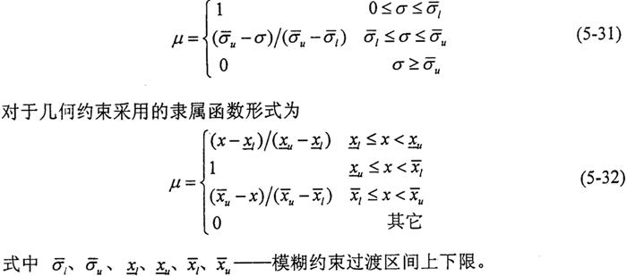 5.4.3.3最優(yōu)水平截集的確定 采用最優(yōu)水平截集法來實(shí)現(xiàn)從模糊優(yōu)化模型向普通優(yōu)化模型的轉(zhuǎn)化。當(dāng)我們規(guī)定某一隸屬度λ(O≤λ≤1)值的時(shí)候,就由模糊集合分解出一個(gè)普通的集合,將模糊優(yōu)化問題轉(zhuǎn)化為普通優(yōu)化問題處理;而一系列不同的λ的普通集合又對應(yīng)一個(gè)模糊集合。因此,λ截集是溝通普通集合與模糊集合的橋梁。λ取值越大,設(shè)計(jì)結(jié)果越可靠,λ取值越小,設(shè)計(jì)結(jié)果越經(jīng)濟(jì),所以在[O,l]區(qū)間內(nèi)存在一個(gè)最佳的λ*值,使設(shè)計(jì)結(jié)果既經(jīng)濟(jì)又可靠,尋求最優(yōu)λ*截集,是實(shí)現(xiàn)模糊優(yōu)化設(shè)計(jì)向普通優(yōu)化設(shè)計(jì)轉(zhuǎn)化的關(guān)鍵。本文采用二級模糊綜合評判的方法求解λ*,分別建立備擇集、因素集、因素權(quán)重集、因素等級權(quán)重集,并確定評判數(shù)學(xué)模型,由此計(jì)算出最優(yōu)置信水平λ*。