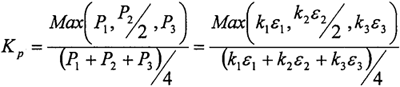 試驗(yàn)中選用的電阻應(yīng)變片長(zhǎng)度為0.2mm,電阻為119.8±0.2Ω,相差很小,即k1、k2/2、k3彼此差別很小,所以上式簡(jiǎn)化為:
