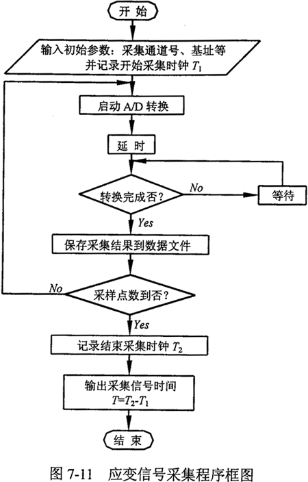 對(duì)應(yīng)于所選用的A/D轉(zhuǎn)換板,編制的應(yīng)變信號(hào)采集程序框圖如圖7-11所示。